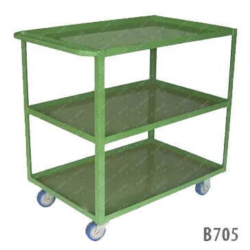 É um carro bandeja produzido com colunas em aço carbono e três prateleiras em aço carbono , com rodas de 4 polegadas